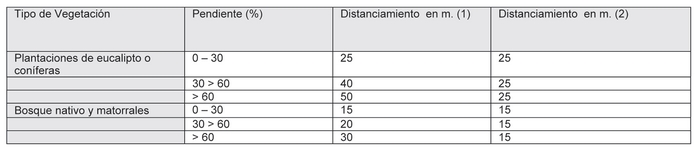 Las edificaciones de los proyectos de loteo y conjuntos de vivienda acogidos a la ley N° 19.537, colindantes con áreas de vegetación continua deberán considerar un distanciamiento mínimo al deslinde del predio con presencia de vegetación continua, de ancho variable de acuerdo a la siguiente tabla: