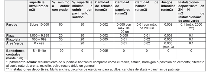 ARTÍCULO 14.- CONDICIONES PARA LAS ÁREAS VERDES AFECTAS A UTILIDAD PÚBLICA. Para efectos de la interpretación de este artículo, las áreas verdes afectas a utilidad pública objeto de ornamentación se clasificarán en parques, plazas, plazoletas, áreas verdes y bandejones centrales según la superficie involucrada. Para cada una de ellas las condiciones de diseño serán las siguientes: