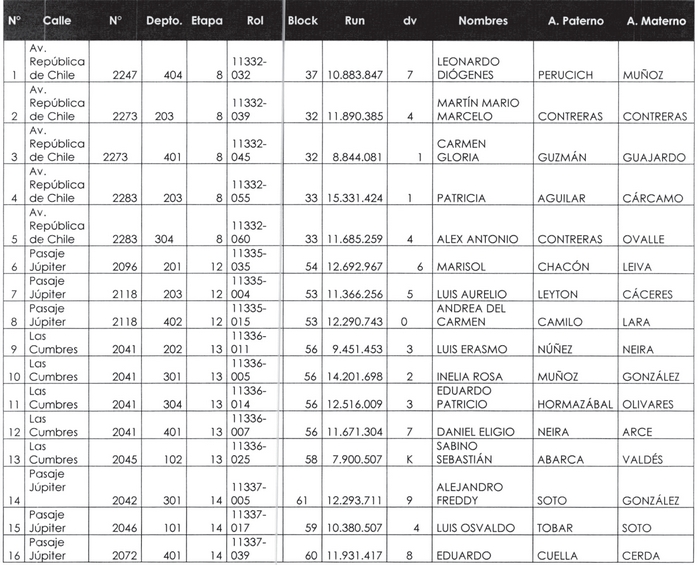 Pertenecientes al Conjunto Habitacional Villa Cordillera, Comisión Tasadora integrada por los peritos don Jorge Godoy Rojas, Carlos Henríquez Durán y Jorge Rosales Flores, arquitecto, arquitecto y constructor civil, respectivamente, según informe de fecha marzo de 2011, monto provisional para: Leonardo Diógenes Perucich Muñoz, $4.852.383.-; Martín Mario Marcelo Contreras Contreras $5.326.277.-; Carmen Gloria Guzmán Guajardo $4.852.383.-; Patricia Aguilar Cárcamo $4.616.107.-; Alex Antonio Contreras Ovalle $4.410.753; Marisol Chacón Leiva $5.536.489.-; Luis Aurelio Leyton Cáceres $4.798.291.-; Andrea del Carmen Camilo Lara $4.383.948.-; Luis Erasmo Núñez Neira $5.412.940.-; Inelia Rosa Muñoz González $5.173.896.-; Eduardo Patricio Hormázabal Olivares $5.173.896.-; Daniel Eligio Neira Arce $4.934.852.-, Sabino Sebastián Abarca Valdés $4.691.215.-; Alejandro Freddy Soto González $5.265.898.-; Luis Osvaldo Tobar Soto $4.770.950.-; Eduardo Cuella Cerda $5.026.854.-, cuyo pago se realizará mediante consignación en Cuenta Corriente del Tribunal correspondiente.