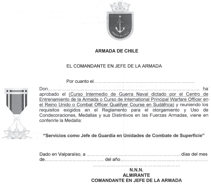 Tendrán derecho a esta Medalla, quienes acrediten haber aprobado el Curso Intermedio de Guerra Naval dictado por el Centro de Entrenamiento de la Armada, o equivalente en el extranjero; y además haber ejercido después del curso al menos 1 año como Jefe de Guardia o como Comandante de una Unidad de Combate.