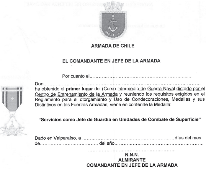 El Oficial que haya obtenido el primer lugar en el Curso Intermedio de Guerra Naval y que haya cumplido con los demás requisitos, recibirá sólo la medalla correspondiente a la categoría "Servicios como Jefe de Guardia de Unidades de Combate de Superficie - Primer Lugar".