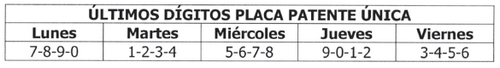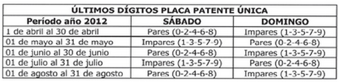 1º Prohíbese la circulación de los vehículos motorizados de cuatro o más ruedas, de acuerdo al último dígito de su placa patente única. Esta restricción regirá desde el día 1 de abril de 2012 hasta el 31 de agosto del mismo año, de lunes a viernes, excepto los días festivos, entre las 07:30 y las 21:00 horas, en toda la provincia de Santiago y en las comunas de San Bernardo y Puente Alto, de acuerdo al siguiente calendario: