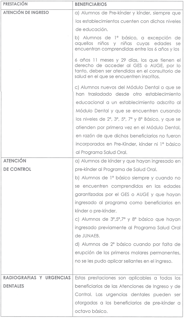 D.O. 04.05.2017acciones preventivas e interceptivas de ortodoncia); unidades educativas y enseñanza de hábitos de higiene bucal, otorgadas a cada estudiante atendido. Además, en los estudiantes beneficiarios se pueden realizar, según lo requieran, atenciones de radiografías y urgencias.