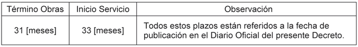 1. Autorízase a la concesionaria para modificar los plazos de término de obras e inicio de servicio, autorizados mediante documento citado en letra f) de los Vistos, según se indica a continuación: