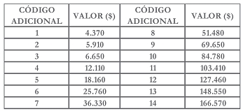 a) Reemplázase, en el inciso segundo del artículo 3°, la tabla de valores de los códigos adicionales por la siguiente:
