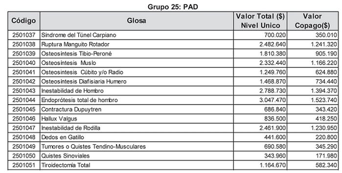 "Tendrán un recargo del 50% las prestaciones que, de acuerdo a calificación médica, se efectúen fuera de horario hábil, con excepción de las prestaciones del Grupo 02 (Día Cama y Día Cama de Hospitalización en todas sus variedades); Derechos de Pabellón o Quirófano, Sala de Partos o Sala de Procedimientos; las prestaciones del Grupo 01 sub-grupo 01 códigos 01-01-001, 01-01-002, 01-01-003, 01-01-004, 01-01-005, 01-01-008, 01-01-010 y 01-01-020; las prestaciones del Grupo 04 sub-grupo 05; las prestaciones del Grupo 05 Medicina Nuclear y Radioterapia; las prestaciones del Grupo 07 sub-grupo 02; las prestaciones del Grupo 09 sub-grupo 02; las prestaciones del Grupo 13 sub-grupo 03; las prestaciones códigos 19-01-023, 19-01-025, 19-01-026, 19-01-027, 19-01-028 y 19-01-029, las prestaciones del Grupo 25 correspondientes a Pago Asociado a Diagnóstico (PAD), las prestaciones del Grupo 26, Atenciones Integrales, otros Profesionales y las prestaciones del Grupo 28, Pago Asociado a Emergencia.".