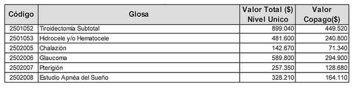 No obstante lo anterior, no tendrán derecho a recargo en los Grupos 2 y 3 del Rol las siguientes prestaciones: códigos 01-01-003 (Consulta Médica Especialidades); 01-01-020 (Atención Médica Integral); 03-05-064 (Seroteca y mantención en la base de receptores cadáver); 03-05-182 (Reacción de Polimerasa en Cadena, PCR); 05-01-135 (PET-CT); 11-01-140 (Tratamiento médico EMRR); 11-01-141 (Tratamiento Rehabilitación EMRR); 11-01-142 (Tratamiento Brote EMRR); 12-01-027 (Examen optométrico c/s Prescripción de Lentes); 19-01-023 (Hemodiálisis con insumos incluidos); 19-01-024 (Hemodiálisis sin insumos); 19-01-025 (Peritoneodiálisis); 19-01-026 (Peritoneodiálisis continua en paciente crónico); 19-01-027 (Hemodiálisis, tratamiento mensual); 19-01-028 (Hemodiálisis con bicarbonato, con insumos por sesión); 19-01-029 (Hemodiálisis con bicarbonato con insumos, tratamiento mensual); todas las prestaciones del Grupo 02 (Atención Cerrada); del Grupo 04, sub-grupo 05 (Resonancia Magnética); del Grupo 07 sub-grupo 02 (Medicina Transfusional); del Grupo 23 (Prótesis); del Grupo 24 (Traslados); del Grupo 25 (Pago Asociado a Diagnóstico -PAD-); del Grupo 26 (Atenciones Integrales, otros Profesionales); del Grupo 28 (Pago Asociado a Emergencia); como asimismo, los Derechos de Pabellón o Quirófano, Sala de Partos y Sala de Procedimientos (Códigos adicionales 1 al 14).