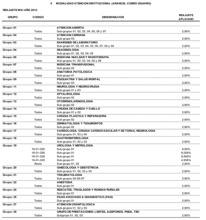 Los inscritos en el Grupo 2 del Rol de esta Modalidad, por el valor señalado en el Arancel reajustado, aumentado en un 30%, excepto para la prestación código 01-01-001 que tendrá un recargo del 6,98%, la prestación código 01-01-010 que tendrá un recargo del 6,54%, la prestación código 01-01-005 que tendrá un recargo del 45,29% y las prestaciones códigos 01-01-004, 01-01-008 y 01-01-009 en que corresponderá un recargo del 45,04%.