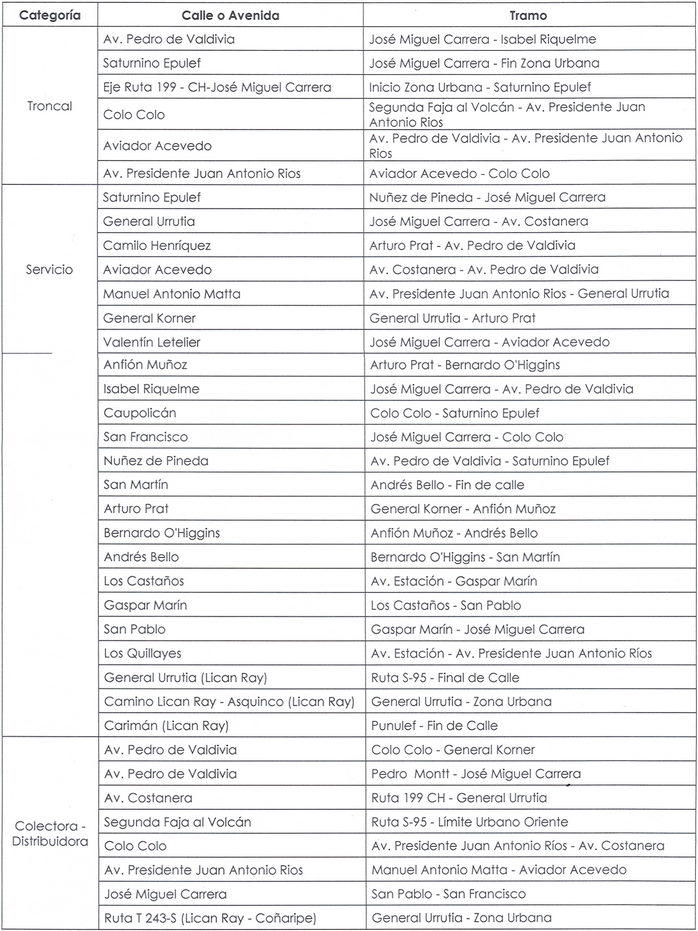 1. Establézcase la Red Vial Básica en la ciudad de Villarrica, la que estará constituida por las calles y avenidas que se detallan a continuación, las que se agrupan de acuerdo a las siguientes categorías: