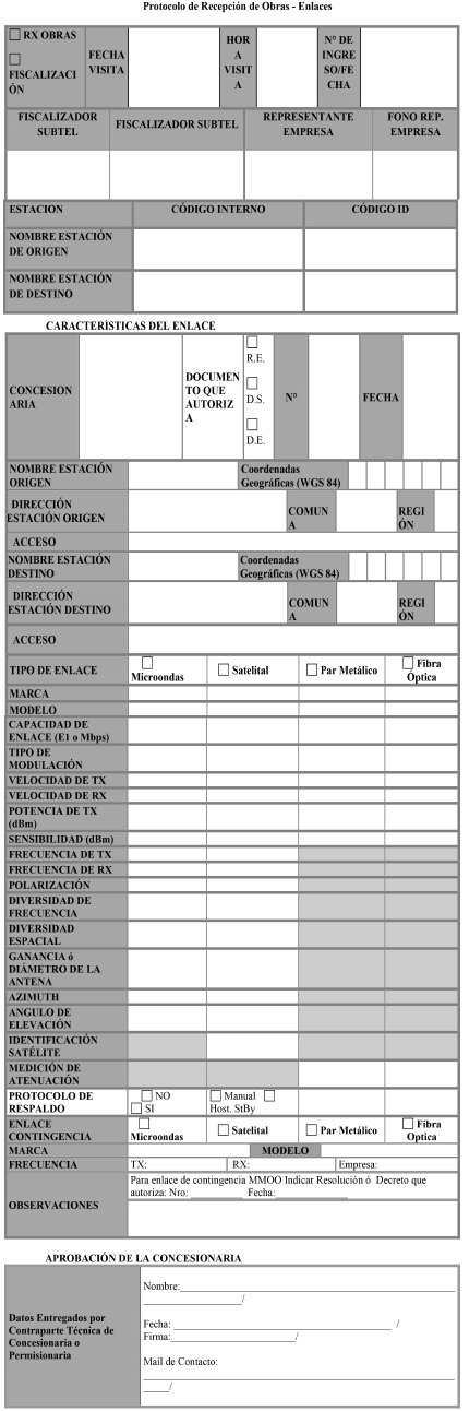 4. Asimismo, en caso de utilizar enlace de terceros, la concesionaria deberá individualizar a la titular del enlace, así como el respectivo acto administrativo que lo autorizó. En caso de utilizar enlace propio deberá adjuntar los antecedentes requeridos en el Anexo II (Protocolo Recepción de Obras - Enlaces).