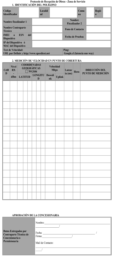 Estas mediciones de cobertura consistirán en mediciones de velocidad de transmisión de datos de subida y bajada de usuario, desde y hacia internet, latencia y de otros parámetros definidos en el Anexo III (Protocolo de Recepción de Obras - Zona de Servicio).