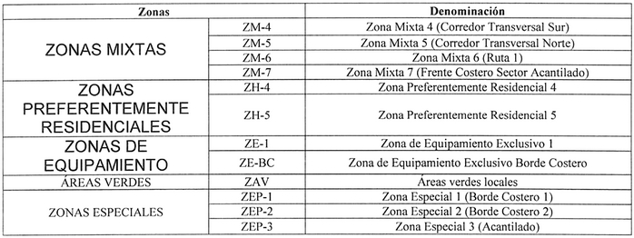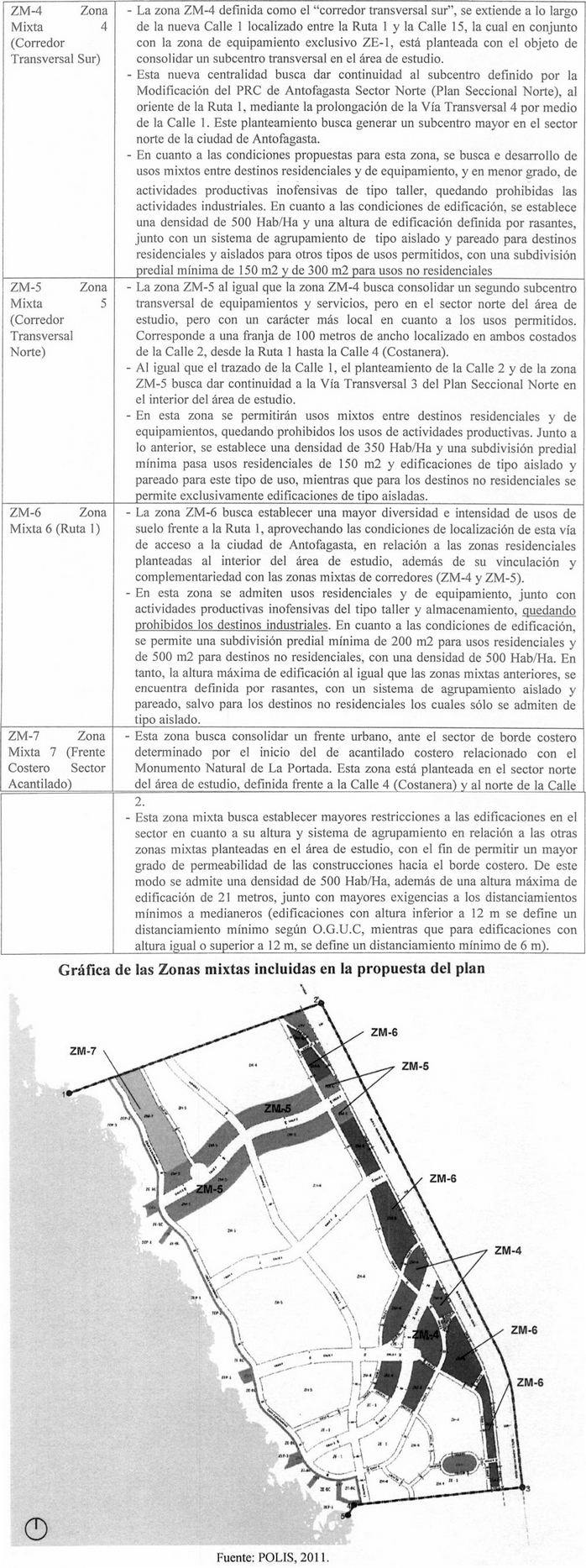 En el área de estudio de La Chimba Norte se proponen cinco zonas de este tipo: ZM-4 Zona Mixta 4 (Corredor Transversal Sur), ZM-5 Zona Mixta 5 (Corredor Transversal Norte), ZM-6 Zona Mixta 6 (Ruta 1), ZM-7 Zona Mixta 7 (Frente Costero Sector Acantilado).