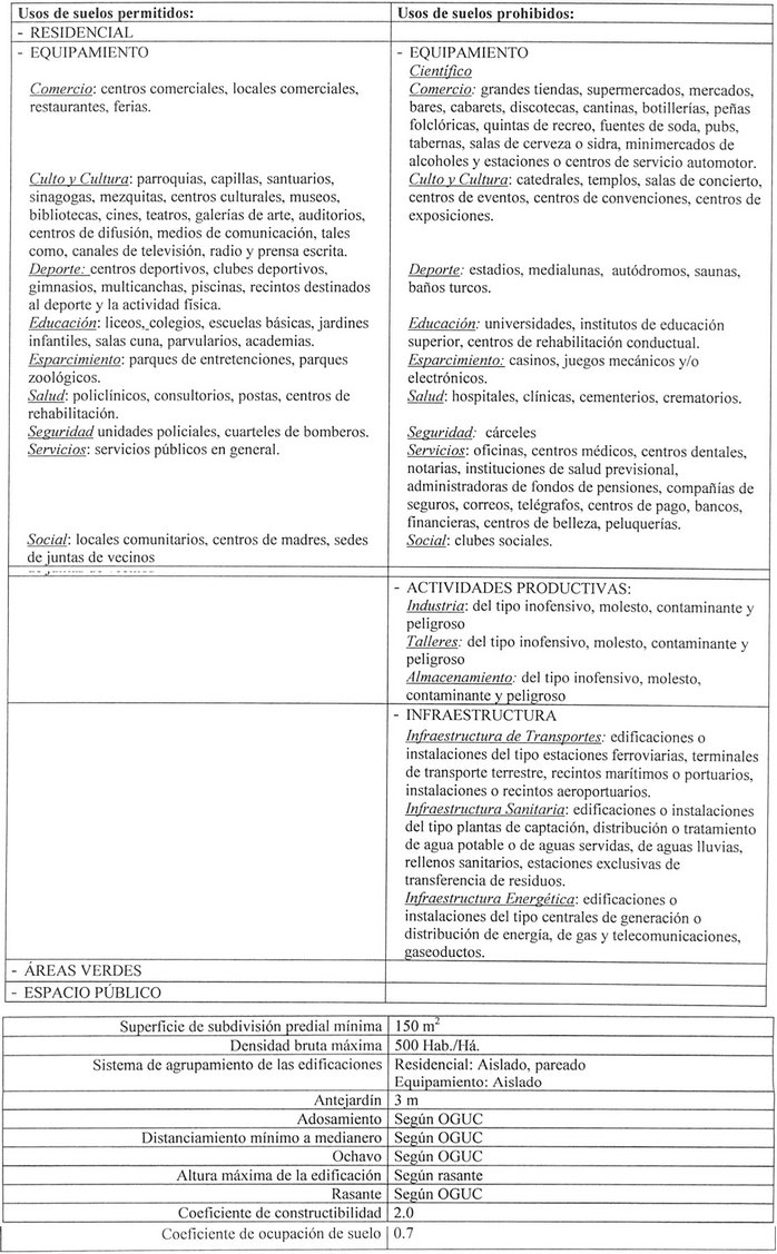 Estas zonas se presentan en general como áreas consolidadas de viviendas o en vías de consolidación que contienen mayoritariamente usos residenciales (vivienda), combinados en menor grado con algunos tipos de equipamiento de tipo básico y compatible con el uso residencial, como son las sedes sociales, canchas deportivas, pequeños comercios y talleres, entre otros.
