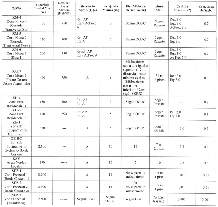 Modifíquese el Artículo 48 del Capítulo VII Definición de Macro-Áreas, Zonificación, Usos de Suelo y Normas Específicas de la Ordenanza Local del Plan Regulador Comunal de Antofagasta, los siguientes aspectos: