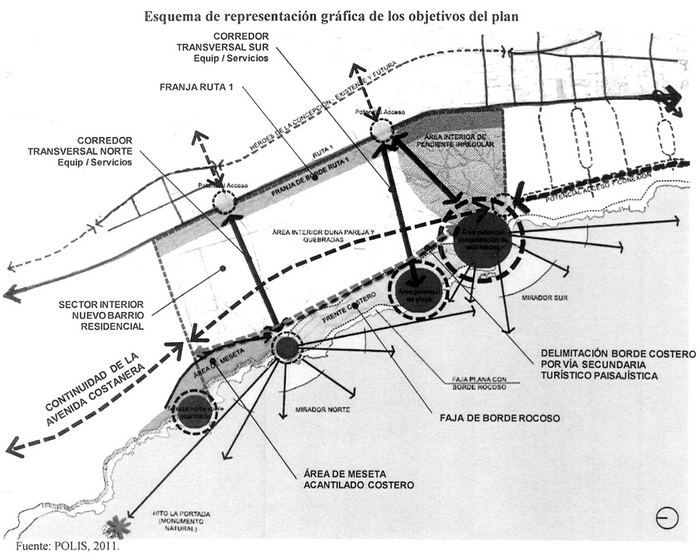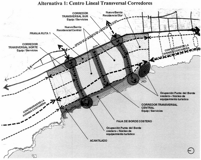* A la vez en el sector de borde costero se plantea la creación de una nueva vía costanera que delimite el sector de borde costero asociado a los atributos naturales del área desarrollable del Plan.