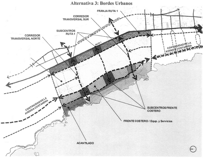 Alternativa 3: Comportamiento positivo (>+1) en relación con los objetivos ambientales planteados (1.5) y en relación con los objetivos del plan (1.3). Al igual que la anterior, esta alternativa no prevé el mejoramiento o implementación de espacios públicos, sino que considera un único borde o parque vinculado a la porción central del borde costero como área verde (objetivo ambiental 3). Esta alternativa provee de un frente de equipamientos, luego de la franja destinada a la protección del borde costero, consecuencia que la hace obtener una valoración mayor en este sentido.