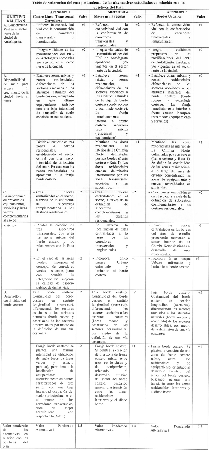 La evaluación de los efectos de las alternativas, ha tenido a la vista la metodología de valoración simple que consiste en atribuir un código, de una escala sencilla, representativo del comportamiento de cada alternativa respecto de cada objetivo del plan y cada objetivo ambiental.