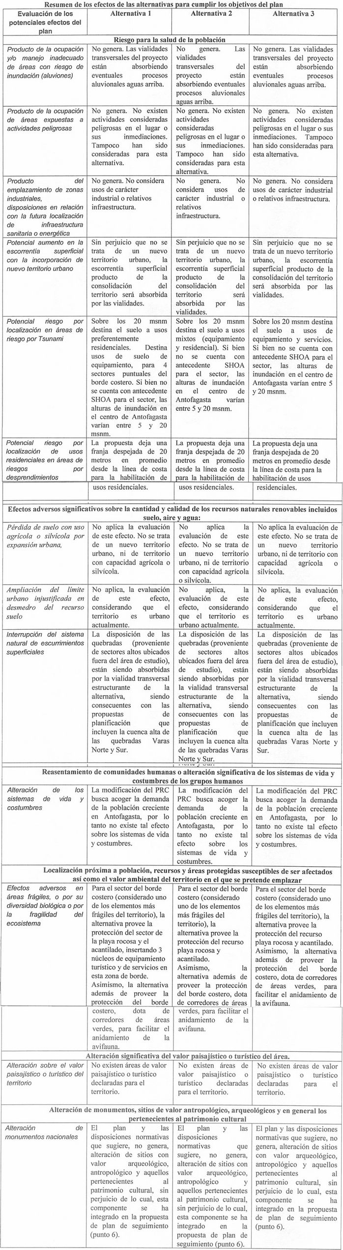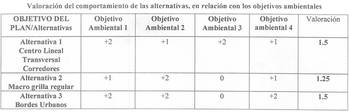 Las tablas a continuación retratan la aplicación de la metodología descrita más arriba. La primera apunta a la valoración del comportamiento de las alternativas en relación con los objetivos del plan. Luego, se integra una tabla de los potenciales efectos de las alternativas de acuerdo a los efectos descritos en el artículo 11 del RSEIA. Por último, se integra una valoración del comportamiento de cada alternativa en relación con los objetivos ambientales del plan.