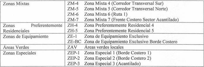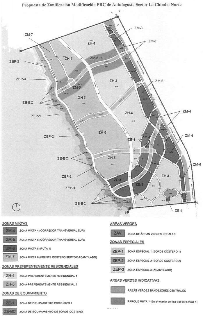 La propuesta de zonificación de la Modificación del PRC de Antofagasta en el Sector de La Chimba Norte, establece cinco tipos de zonas: Zonas Mixtas, Zonas Preferentemente Residenciales, Zonas de Equipamiento, Zonas de Áreas Verdes y Zonas Especiales.