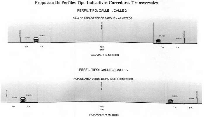 Tomando en consideración el objetivo anterior, los perfiles viales definidos para los corredores viales buscan permitir el desarrollo de parques lineales en su interior. De este modo, los perfiles propuestos en las vías transversales varían entre 64 y 74 metros de ancho entre las líneas oficiales, lo cual permitiría el desarrollo de franjas de áreas verdes sobre los bandejones centrales de las vías, con un ancho que puede variar entre los 40 y 50 metros.