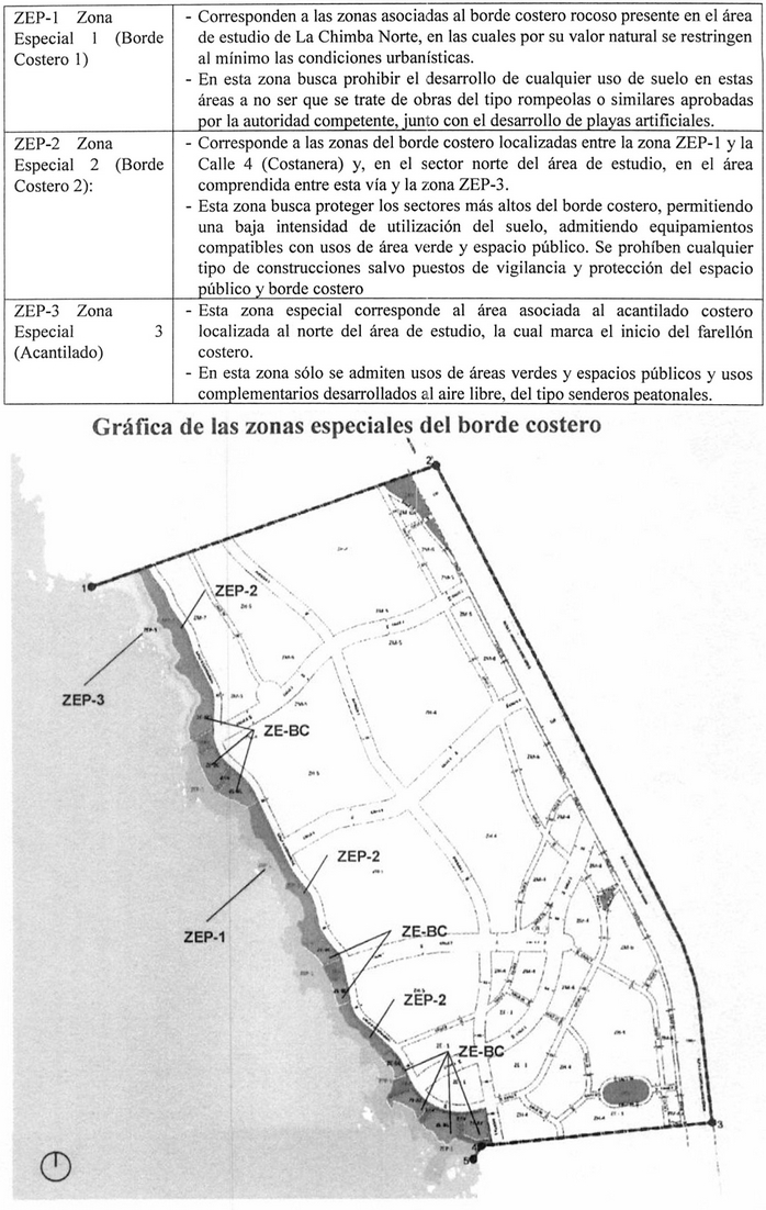 - Constituir una franja de 10 metros contigua a la Calle 4 (Costanera), con el fin de generar un mayor distanciamiento de esta vía, con respecto a las zonas especiales de borde costero (ZEP-1 y ZEP-2) y de las zonas de equipamiento de borde costero (ZE-BC).