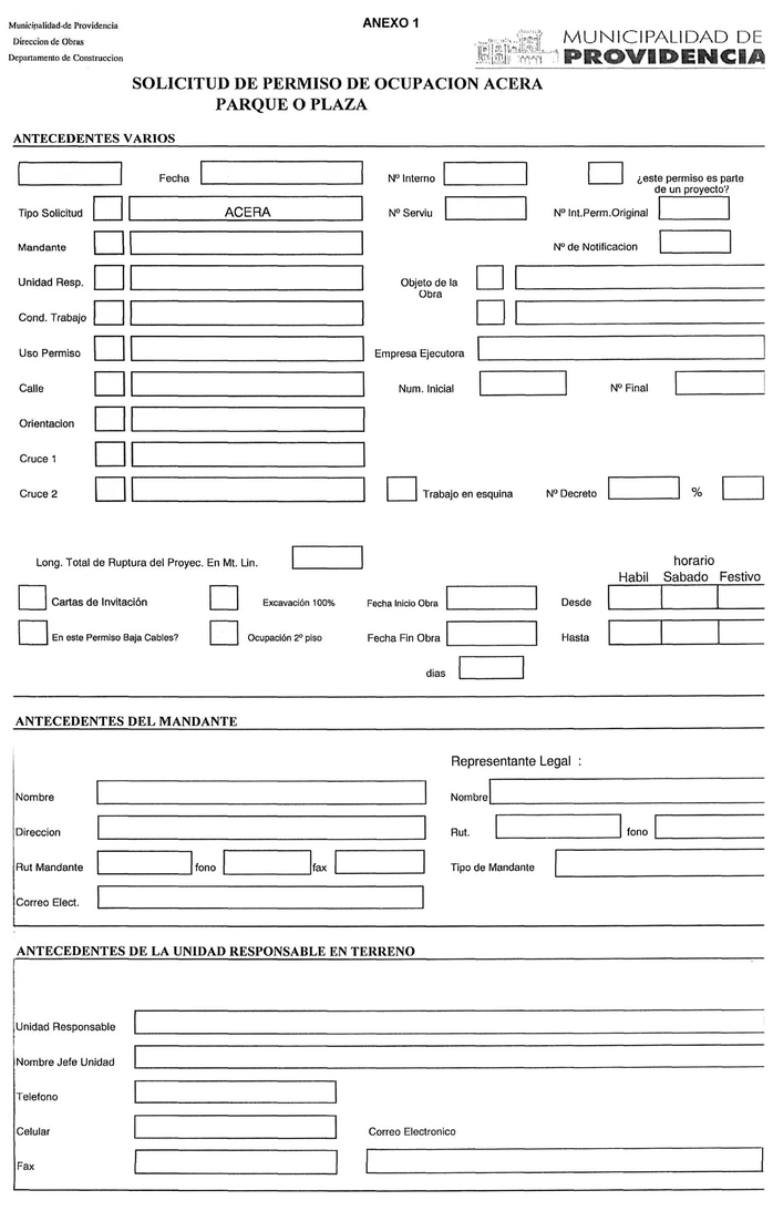 Artículo 10º: La solicitud de permiso de ocupación transitoria del espacio público, para la ejecución de las faenas descritas en el artículo 1º, deberá ajustarse a los formularios que disponga la Dirección de Obras para estos efectos, en el mesón de atención (ver Anexos 1 y 2), o en su página web.