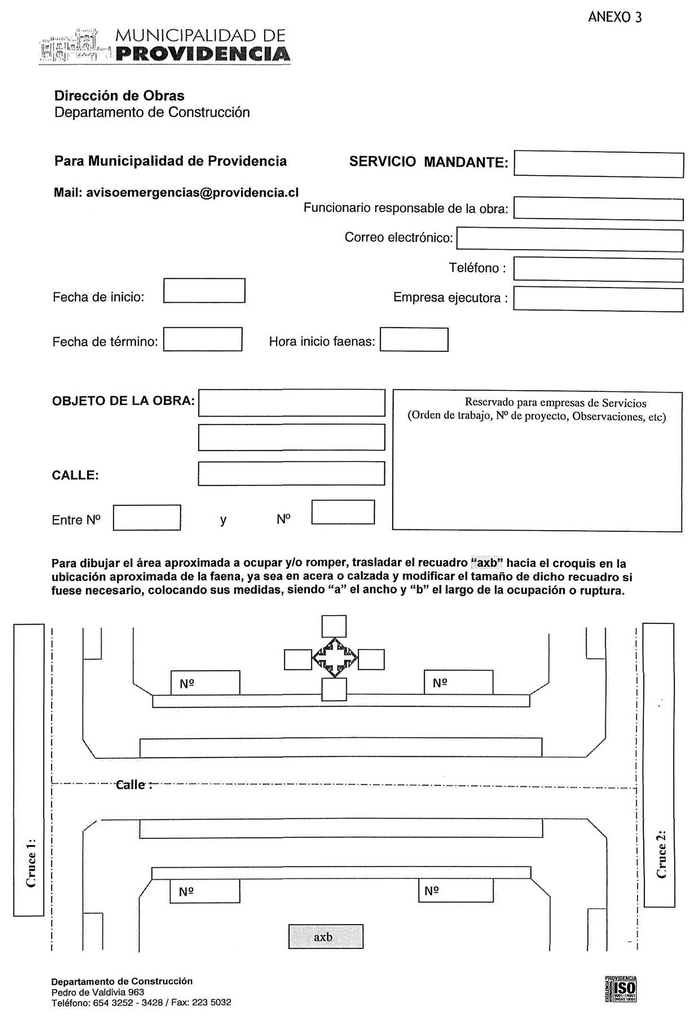 a) Llenar el formulario de solicitud de acera o de calzada, según sea el caso, en papel o a través del sitio web del Municipio, completando todos los campos requeridos, incluyendo el croquis referencial de ubicación de las faenas.
