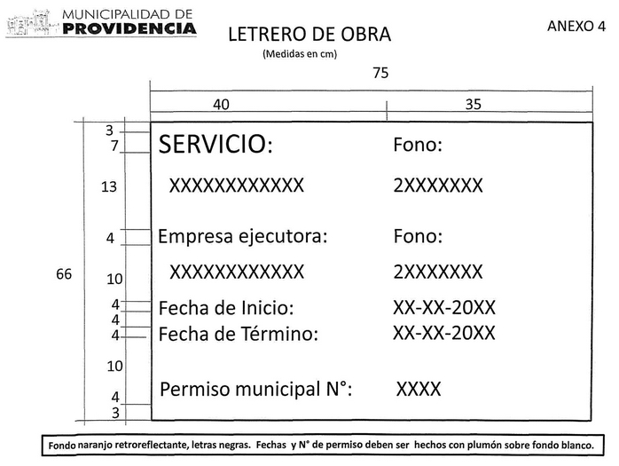 Artículo 54º: En todo trabajo que se ejecute para instalaciones de servicios de utilidad pública, se deberá colocar un letrero de acuerdo al diseño mostrado en el Anexo 4.