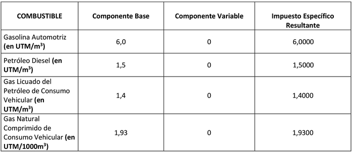 5.- De conformidad con lo señalado en los numerales anteriores, determínanse las tasas de los Impuestos Específicos a los Combustibles establecidos en la Ley Nº 18.502, los cuales serán iguales a su componente base, considerando además el componente variable que puede ser sumado o restado según lo previsto en el artículo 3º de la Ley Nº 20.493.