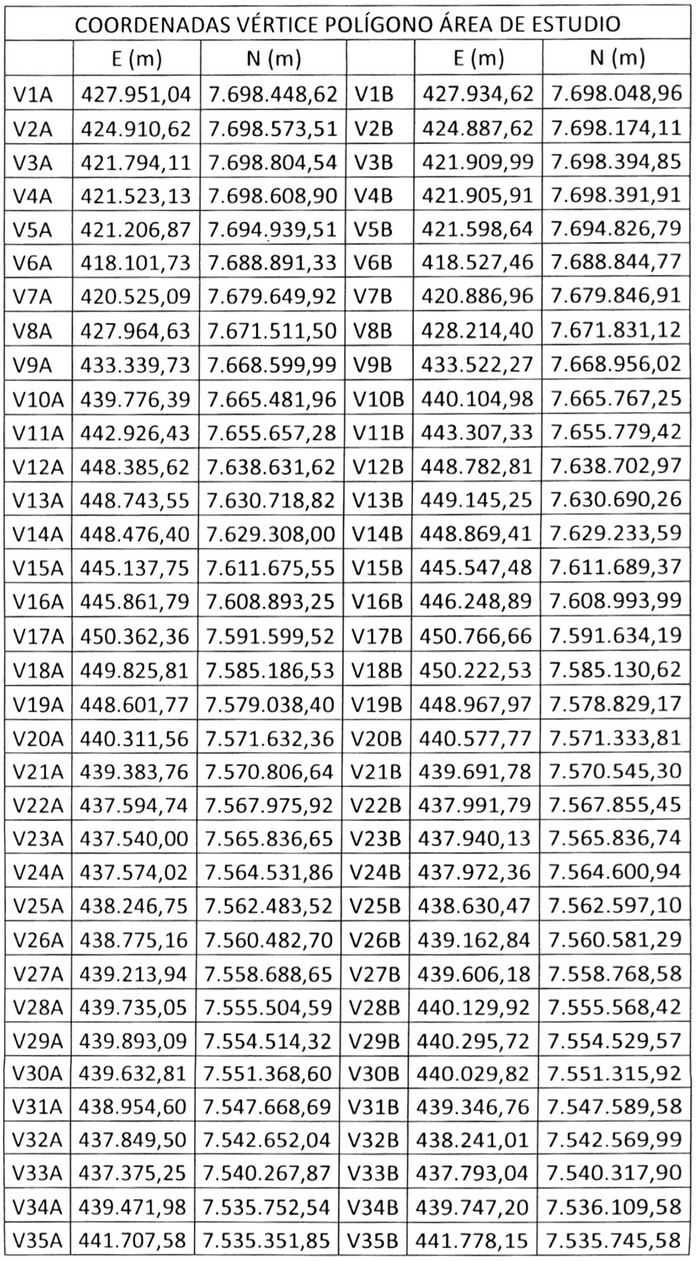 6º.- Que el área objeto de los estudios, la cual se encuentra delimitada por el polígono descrito por las coordenadas UTM (Datum WGS 1984, Huso 19), es la siguiente: