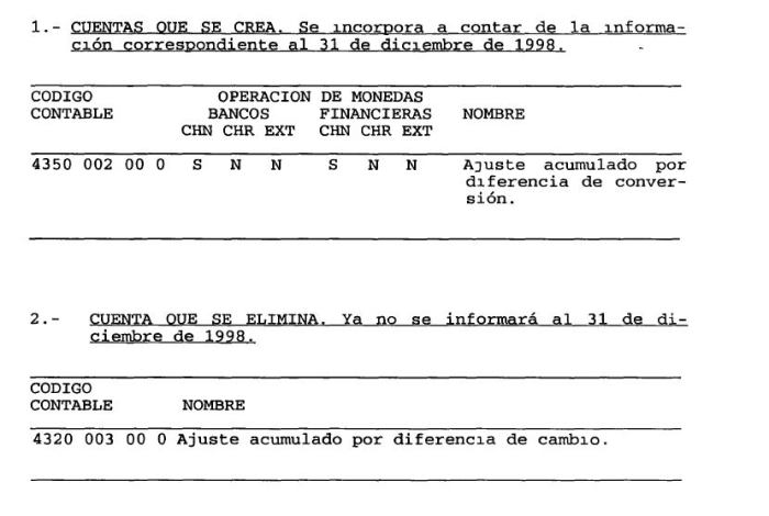 B) En el quinto párrafo del numeral 1.1 del título VI, se sustituye el nombre de la cuenta "Ajuste acumulado por diferencia de cambio" por el de "Ajuste acumulado por diferencia de conversión", y se reemplaza la expresión "partida 4320" por "partida 4350". En consecuencia, se reemplazan las hojas N°s 20, 21 y 25 del Capítulo 11-7, por las que se adjuntan a esta Circular.