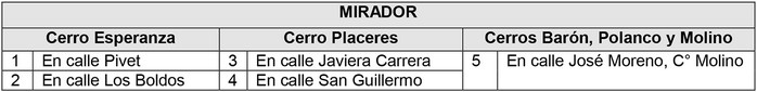 Artículo 7º. Agréguense al artículo 18º de la Ordenanza Refundida del Plan Regulador Comunal de Valparaíso, los siguientes miradores graficados en el plano PRV PEB-02: