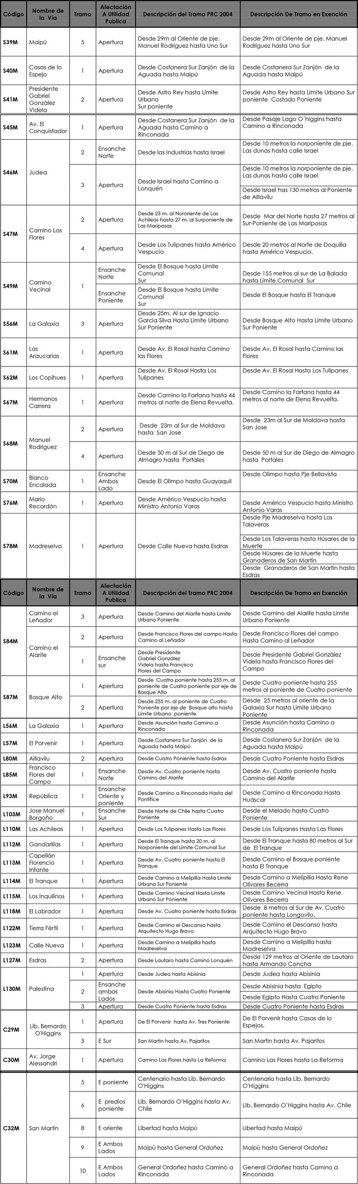 Lo dispuesto en el Plan Regulador Comunal de Maipú, aprobado mediante decreto alcaldicio Nº 6.383, de fecha 05.11.04, publicado en el Diario Oficial el 13 de noviembre 2004, y sus modificaciones posteriores; el artículo 59º de la Ley General de Urbanismo y Construcciones; la Ley Nº 19.939, publicada en el Diario Oficial el 13 de febrero de 2004, que modificó el artículo 59º de la Ley General de Urbanismo y Construcciones, con el objeto de establecer la caducidad a las declaratorias de utilidad pública definidas por los Planes Reguladores Comunales e Intercomunales; la Ley Nº 20.331, publicada en el Diario Oficial el 12 de febrero de 2009, que prorroga las declaratorias de utilidad pública previstas en el artículo 59º de la Ley General de Urbanismo y Construcciones; la modificación Nº 3 del Plan Regulador Comunal de Maipú, denominada "Prórrogas Vialidad Colectora y sus Afectaciones a Utilidad Pública Plan Regulador Comunal", publicada en el Diario Oficial con fecha 12.11.09; la Ley Nº 20.791, publicada en el Diario Oficial el 29 de octubre de 2014, modifica el artículo 59º Ley General de Urbanismo y Construcciones, y teniendo presente las facultades conferidas por la Ley Nº 18.695, de 1988, Orgánica Constitucional de Municipalidades.