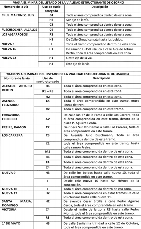 NÓMINA DE VÍAS DESAFECTADAS POR DECLARATORIAS DE UTILIDAD PÚBLICA DEL PLAN REGULADOR COMUNAL DE OSORNO