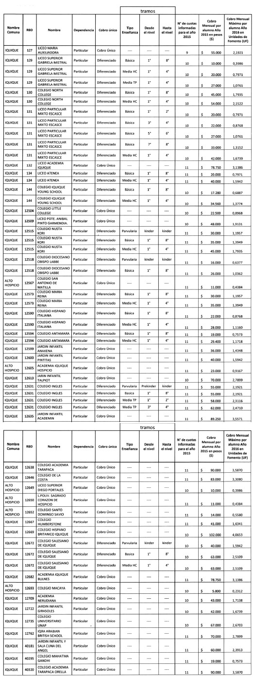 Artículo 1º: El cobro mensual máximo por alumno, de acuerdo a lo informado para el año 2015 por los establecimientos educacionales adscritos al régimen de financiamiento compartido, convertidos en unidades de fomento, al valor de dicha unidad al 1 de agosto de 2015 ($25.090,61) y que se aplicará el año escolar 2016, será de:
