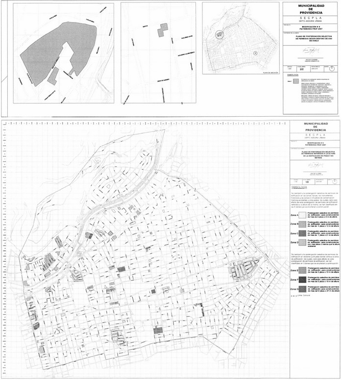 - Zona F (color azul) que posterga los permisos de construcción para edificaciones mayores a 5 pisos o 16 m de altura.