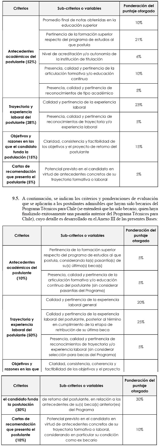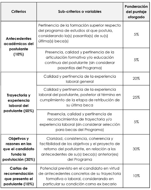 No obstante lo anterior, con el fin de resguardar el buen uso de los recursos públicos involucrados y considerando que el programa de estudios relacionado con la beca debe cumplir el objetivo de perfeccionar al beneficiario, los ex becarios del Programa Técnicos para Chile que postulen al presente concurso serán sometidos al procedimiento de evaluación de manera específica y diferenciada, teniendo en cuenta de manera significativa los antecedentes posteriores al término satisfactorio de su última beca financiada por el Programa (tanto en el ámbito laboral como académico). De la misma manera, se evaluará en especial la relación y pertinencia de su proyecto de perfeccionamiento para la presente convocatoria, con respecto a su experiencia anterior como becario y/o postulante.