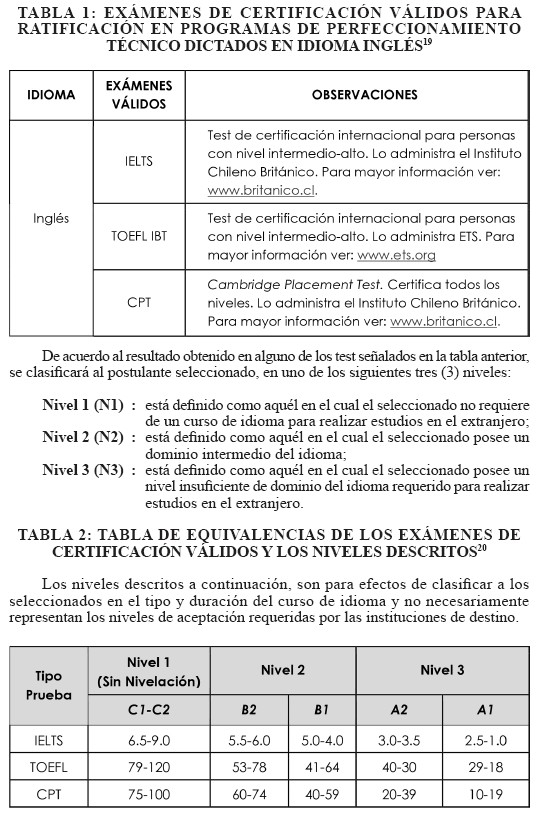 20 Esta equivalencia de exámenes es referencial, por lo que no necesariamente será la que apliquen las Instituciones Educacionales Extranjeras. Los niveles A1, A2, B1, B2, C1 y C2 corresponden a clasificaciones del Common European Framework of Reference (CEFR). El postulante/seleccionado debe revisar las exigencias idiomáticas descritas en las fichas de los programas que se incluyen en el Anexo IV.