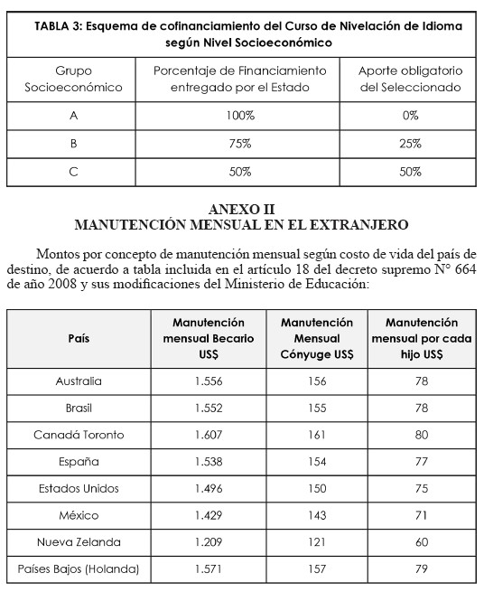 Para efectos del financiamiento de los cursos de nivelación de idioma en Chile, se clasificará a los seleccionados según la información que provean a través del Formulario de Acreditación Socioeconómica (FAS) 2016, en tres grupos socioeconómicos: A, B y C, siendo A el grupo de menor nivel socioeconómico. El referido formulario, debió ser completado por el seleccionado durante la etapa de postulación (documento obligatorio). Esta clasificación será utilizada para fines estadísticos y para efectos del cofinanciamiento de los cursos entre el Programa y el seleccionado, de acuerdo a la siguiente tabla: