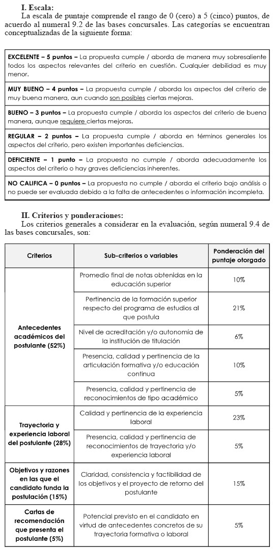 El procedimiento realizado por el Comité de Evaluación para asignar el puntaje final a cada postulación comprende tres etapas. La primera es una revisión remota de cada postulación mediante "evaluación por pares" (independientemente por dos evaluadores, quienes no conocen el resultado del análisis realizado por los otros expertos). La segunda es una revisión remota de discrepancias, es decir, aquellas evaluaciones cuyos puntajes totales asignados por ambos evaluadores difieran en más de un 20% sobre el puntaje máximo asignable por el evaluador, los antecedentes se presentarán a un tercer evaluador y el puntaje final se calculará obteniendo el promedio entre el asignado por éste y el puntaje superior más cercano, de los evaluadores participantes de la etapa anterior. La tercera etapa consiste en la realización presencial de un Panel de Evaluación para cada área disciplinaria del Comité, conformado por evaluadores del correspondiente Comité de Evaluación, cuya función es: consensuar el puntaje final de acuerdo a cada criterio y sub-criterio, y sus correspondientes ponderaciones según las bases concursales; revisar inconsistencias en puntuación entre postulaciones con antecedentes académicos similares; y, asignar puntuación de variables de evaluación y/o bonificación de naturaleza cuantitativa.