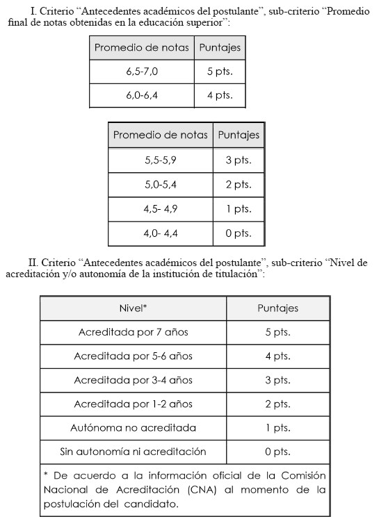 III. a) Criterio "Antecedentes académicos del postulante", sub-criterios "Pertinencia de la formación superior respecto del programa de estudios al que postula" (incluyendo variante que considera "la(s) pasantía(s) de su(s) última(s) beca(s)"), "Presencia, calidad y pertinencia de la articulación formativa y/o educación continua del postulante" y "Presencia, calidad y pertinencia de reconocimientos de tipo académico".
