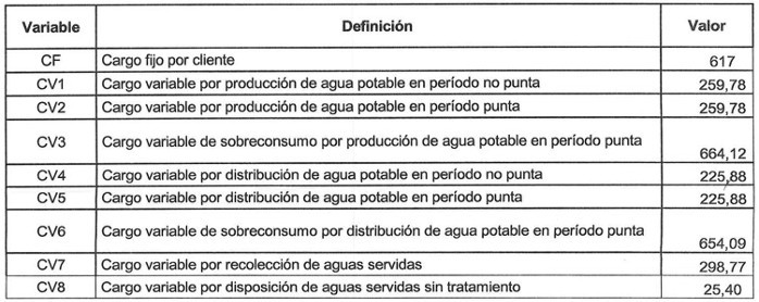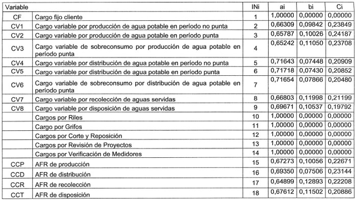 La definición de las variables incorporadas en las fórmulas tarifarias anteriores y sus respectivos valores, al 31 de diciembre de 2014, son los indicados a continuación, para los grupos de localidades que se señalan: