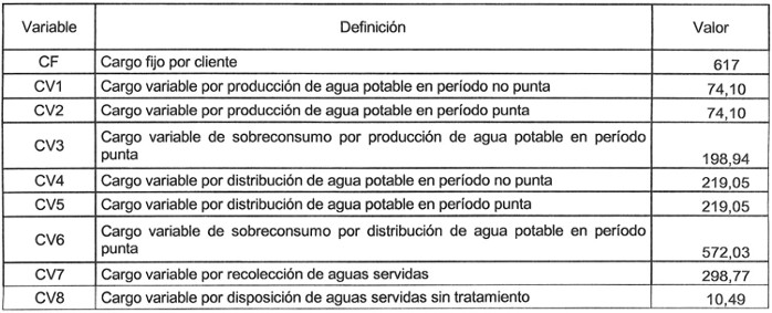 La definición de las variables incorporadas en las fórmulas tarifarías anteriores y sus respectivos valores son los que se indican a continuación:
