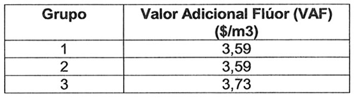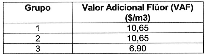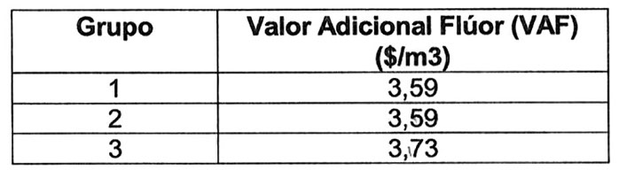 En las zonas abastecidas por sistemas de producción que incorporen la fluoruración del agua potable, el cargo CV3 se incrementará en VAF pesos por metro cúbico para las localidades de cada grupo tarifario, según los valores presentados a continuación: