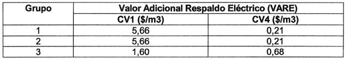 Cuando para un grupo tarifario se construyan y entren en operación la totalidad de las obras adicionales de respaldo eléctrico en instalaciones de agua potable, establecidas en el plan de desarrollo del prestador, los cargos CV1 y CV4 se incrementarán en VARE pesos por metro cúbico según los valores presentados a continuación: