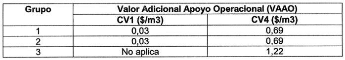 . Cuando para un grupo tarifario se construyan y entren en operación la totalidad de las obras adicionales de apoyo operacional en instalaciones de agua potable, establecidas en el plan de desarrollo del prestador, los cargos CV1 y CV4 se incrementarán en VAAO pesos por metro cúbico según los valores presentados a continuación: