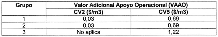. Cuando para un grupo tarifario se construyan y entren en operación la totalidad de las obras adicionales de apoyo operacional en instalaciones de agua potable, establecidas en el plan de desarrollo del prestador, los cargos CV2 y CV5 se incrementarán en VAAO pesos por metro cúbico, según los valores presentados a continuación: