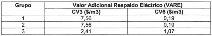 Cuando para un grupo tarifario se construyan y entren en operación la totalidad de las obras adicionales de respaldo eléctrico en instalaciones de agua potable, establecidas en el plan de desarrollo del prestador, los cargos CV3 y CV6 se incrementarán en VARE pesos por metro cúbico, según los valores presentados a continuación: