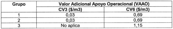. Cuando para un grupo tarifario se construyan y entren en operación la totalidad de las obras adicionales de apoyo operacional en instalaciones de agua potable, establecidas en el plan de desarrollo del prestador, los cargos CV3 y CV6 se incrementarán en VAAO pesos por metro cúbico, según los valores presentados a continuación: