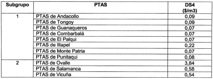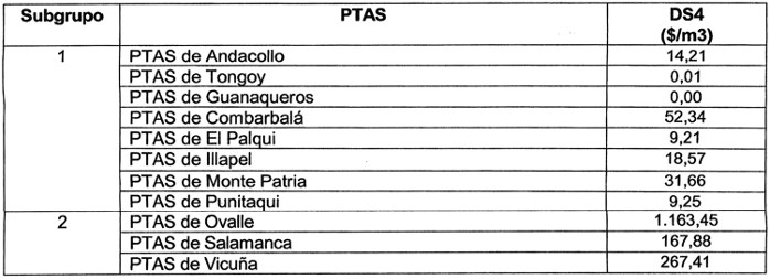 Subgrupo 1: En los sistemas de las localidades de Andacollo-El Peñón, Tongoy, Guanaqueros, Canela Alta, Canela Baja, Combarbalá, Paihuano, Peralillo, Sotaquí, El Palqui, Illapel, La Serena-Algarrobito, Coquimbo, Los Vilos, Monte Patria y Punitaqui el costo de capacidad del sistema de disposición (CCT) se verá incrementado en 434,44 pesos por metro cúbico en las localidades que cuenten con servicio de tratamiento de aguas servidas.
